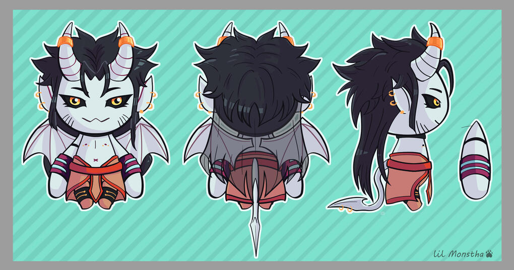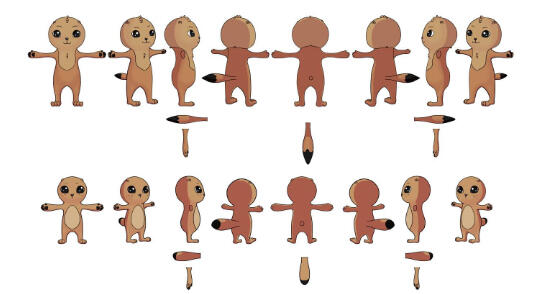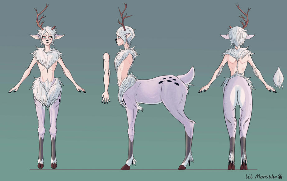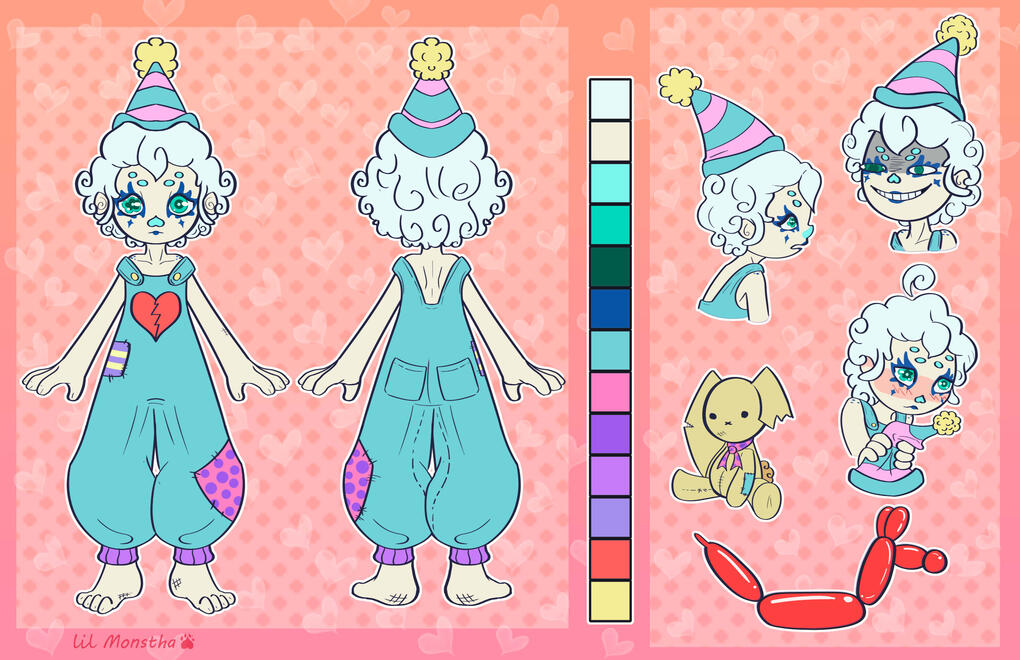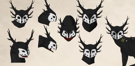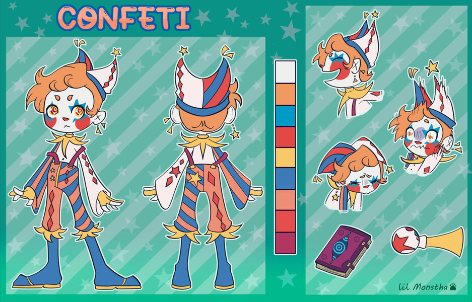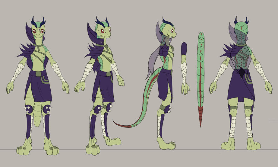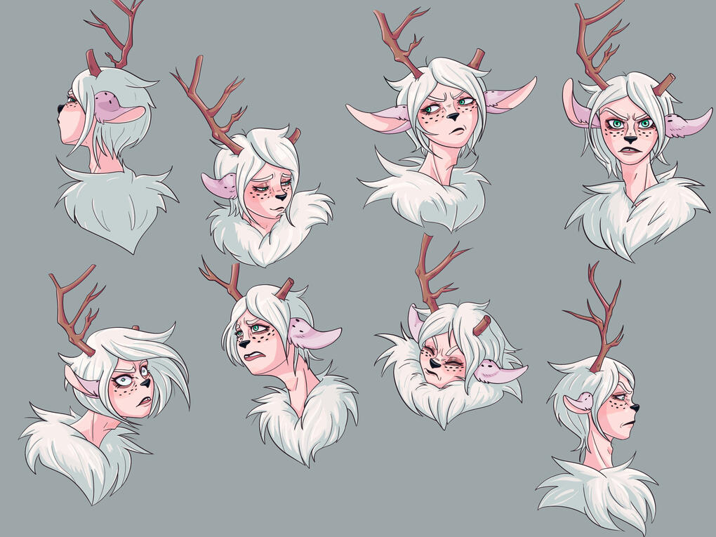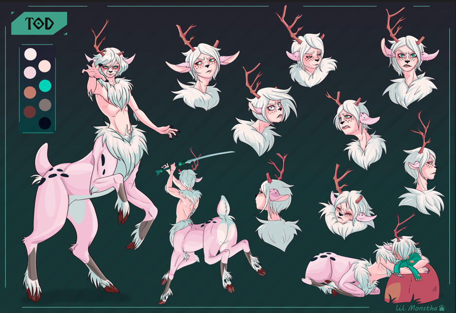 Full vew full front, back/profile view, 3 headshot, colour palette, 2 props, basic painted